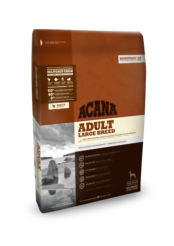 ACANA Adult Large Breed, tanıdığımız ve güven duyduğumuz kişiler tarafından yetiştirilen ve avlanan, insan tüketimine elverişli olduğu kanıtlanan ve sonrasında ödüllü mutfaklarımıza kadar her gün taptaze olarak ulaştırılan, eşi benzeri olmayan çeşitlilikte yöresel içerikler içerir!