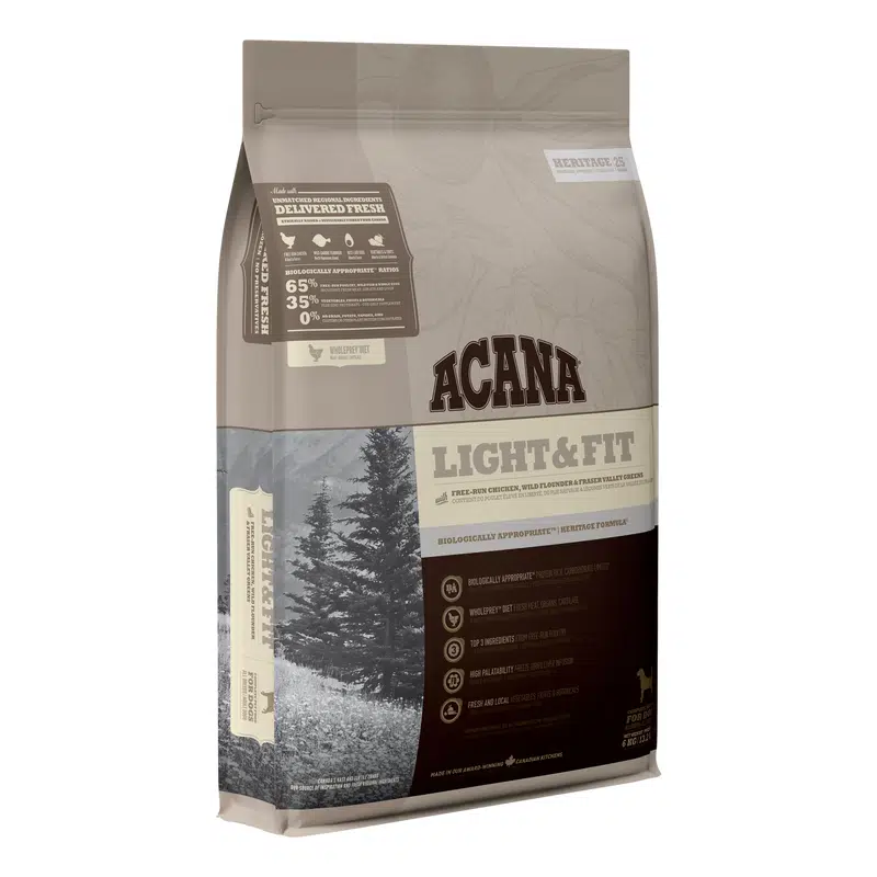 Fazla kilolu köpekler, yağsız kas kütlesini geliştirmek için, proteinlerden zengin, vücudun fazla yağlanmasına neden olacak karbonhidratlar bakımından sınırlandırılmış bir beslenmeden yararlanırlar. Benzeri görülmemiş beslenme ve lezzet için taze olarak teslim edilen bölgemizin serbest dolaşan tavuklarını, tüm yumurtalarını ve serbest avlanan pisi balığı içeren ACANA Light & Fit et ile doludur. Sağlıklı kan şekeri seviyesini teşvik etmek için, ACANA pirinç, mısır veya patates gibi yüksek glisemikli içerikler yerine taze düşük-glisemikli bütün kabak ve balkabağı gibi meyve ve sebzeler içerir.